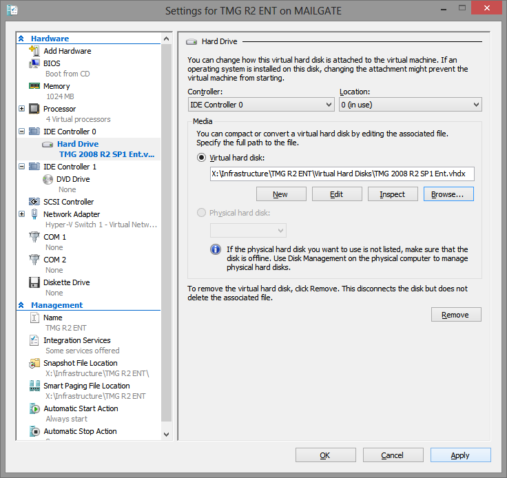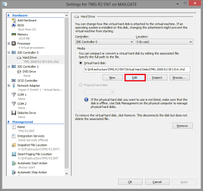 - Open the Hyper-V VM settings, navigate to the hard drive you wish to convert, and click the Edit button, as shown below:
