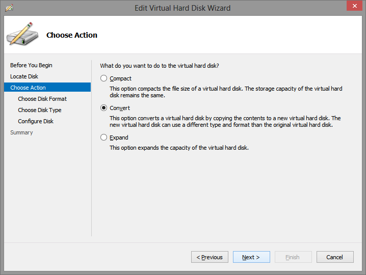 - The Edit Virtual Hard Disk Wizard will start. Select Convert from the Choose Action page and click Next.
