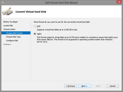 You can convert existing older format VHD disks to the new VHDX format using the Hyper-V Manager console. This process will create a new VHDX disk and copy the data from the existing VHD to the new disk. At the end of the procedure you will have two disks, the original VHD disk and a new VHDX disk with the same contents. You can safely delete the original VHD disk once you have confirmed that the new VHDX disk is fully functional.